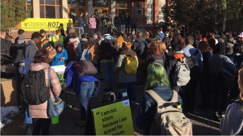 1 ^: _3 W% i# _: e1 ] w! j卡大狂裁员,阿大那边也不好过。本周一上午,在埃德蒙顿大学念书的好多学生愤怒走上了街头来了一场抗议示威大游行。